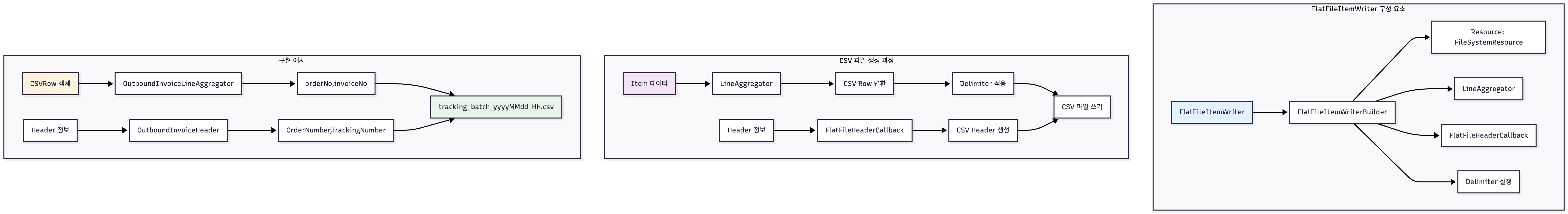 Spring Batch가 Writer 계층에 CSV 생성 책임을 둔 이유는 관심사의 분리(separation of concerns)를 위해서입니다. 데이터 변환 로직(LineAggregator)과 파일 쓰기 로직(FlatFileItemWriter)을 분리함으로써, 각 컴포넌트의 재사용성과 테스트 가능성을 높입니다. 또한 다양한 파일 형식(CSV, 고정폭 파일 등)을 동일한 Writer 구조로 처리할 수 있도록 설계되었습니다.