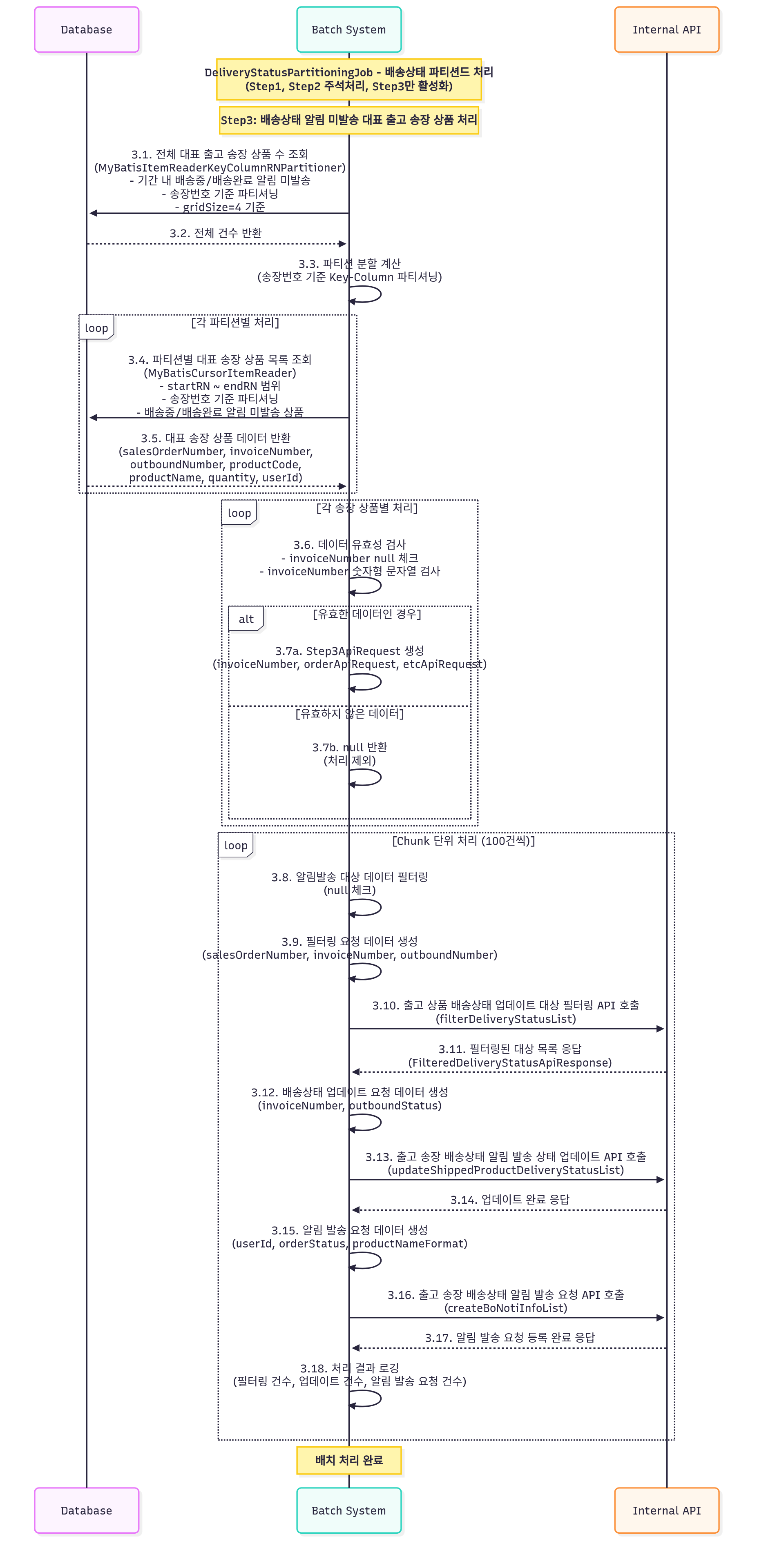 이상과 같이 파티셔닝하여 실무에서 사용한 배송상태 알림발송 병렬처리 배치잡의 다이어그램입니다. 출고송장마다 N개의 출고송장상품 데이터가 조회되므로, 출고송장번호 DENSE_RANK()를 사용해 파티션의 첫번째 출고송장의 출고송장상품부터 마지막 출고송장의 마지막 출고송장상품까지를 정확한 파티션 범위를 갖도록 했습니다.